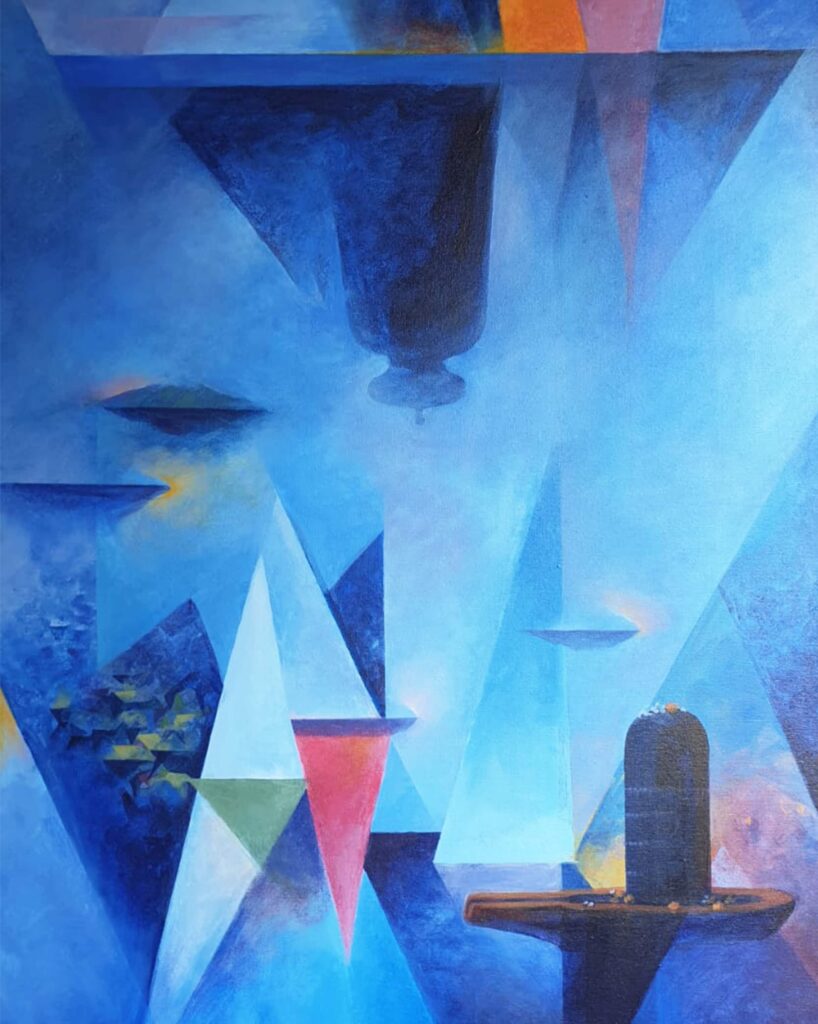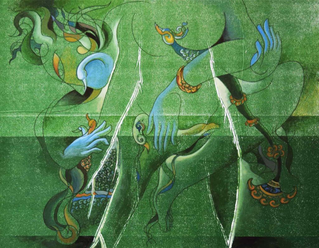 Glances, not lotus flowers, she has strung as a garland above the entrance; a smile, not flowers, Serves as her jasmine bouquet; and her two full breasts with the dew of perspiration replace the pots for offering water. The slender one prepared a solemn reception for her long-awaited lover, presenting only her own body as he entered.